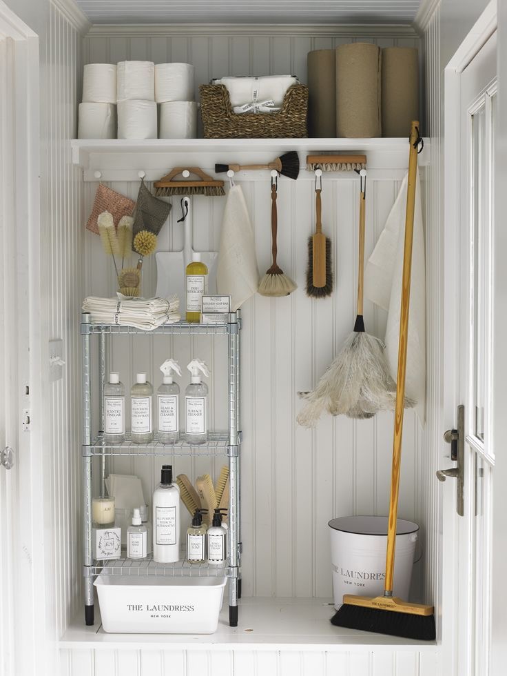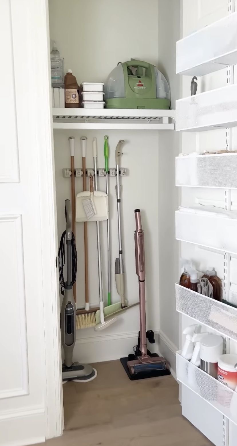 - Store Bulky Items Centrally: Mops, vacuums, bulk refills, and deep-cleaning tools can all live together in one dedicated laundry room or utility closet.
