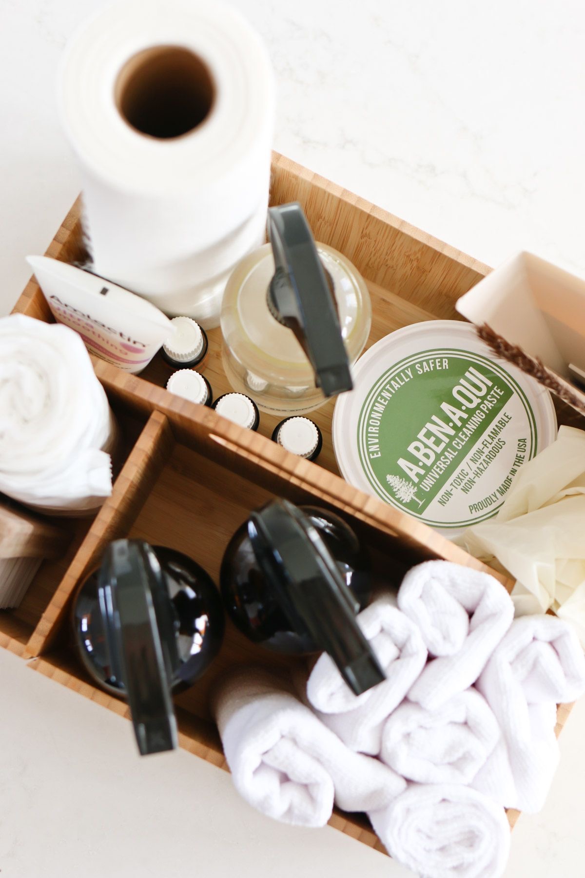 - Kitchen Caddy: Degreaser, counter spray, dish soap, steel wool, and daily wipes. Store this under the kitchen sink.