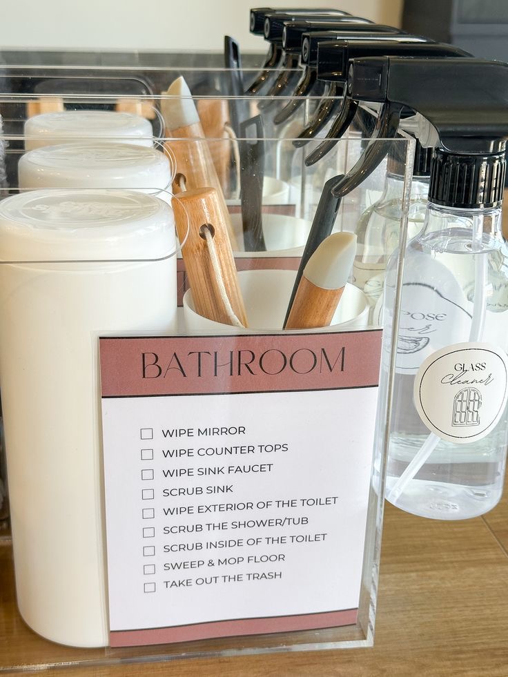- Bathroom Caddy: Toilet cleaner, tile spray, scrubbing brush, gloves, and a few dedicated cloths. Store this under the main bathroom sink or linen closet.