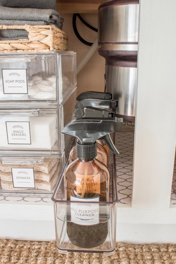 - Go Vertical: Install tension rods under your sink to hang spray bottles by their handles. This frees up the cabinet floor for bins.